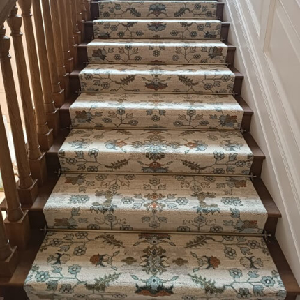 Укладка ковровой дорожки на лестницу. Дорожка укладывалась на двусторонний скотч. В качестве крепления использованы ковровые держатели.
