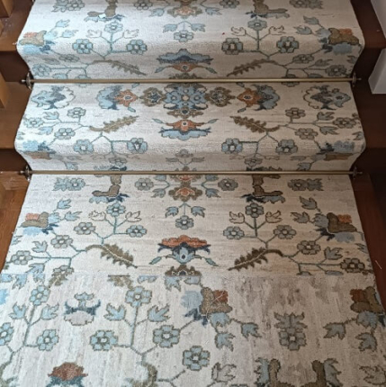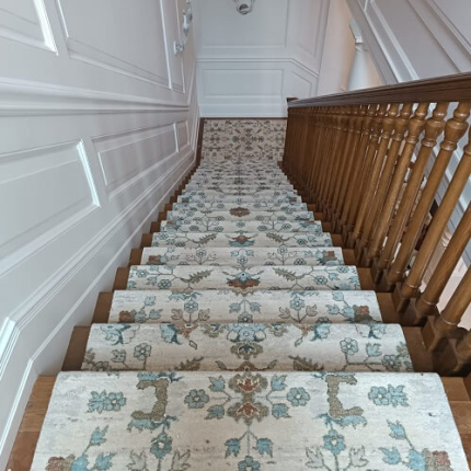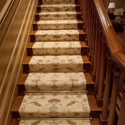 Укладка ковровой дорожки на лестницу. Дорожка укладывалась на двусторонний скотч. В качестве крепления использованы ковровые держатели.