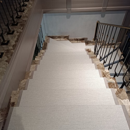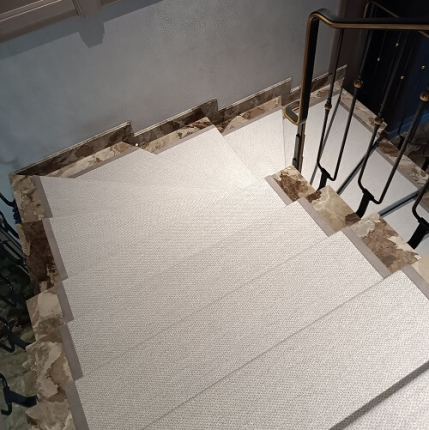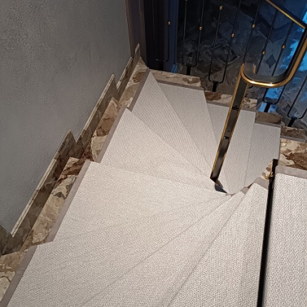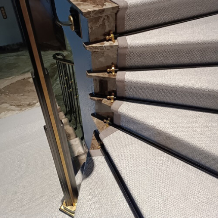 Укладка дорожки на лестницу. Дорожка выкраивалась по лекалу из цельного полотна. Укладывалась на двусторонний скотч. В качестве крепления использованы ковровые держатели - латунь крашенная. Предварительно края дорожки были обшиты лентой Велюр.
